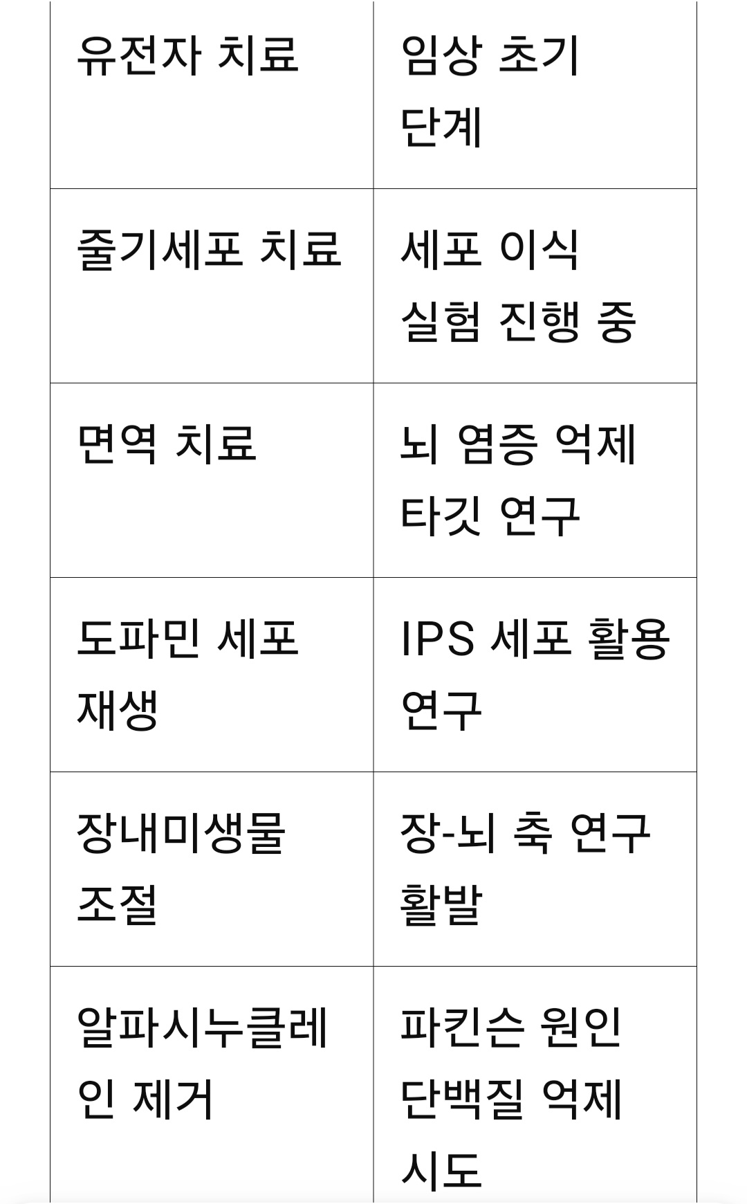 일본, 스웨덴 등 일부 연구팀 → 줄기세포로 도파민 신경세포 재생 임상 중
